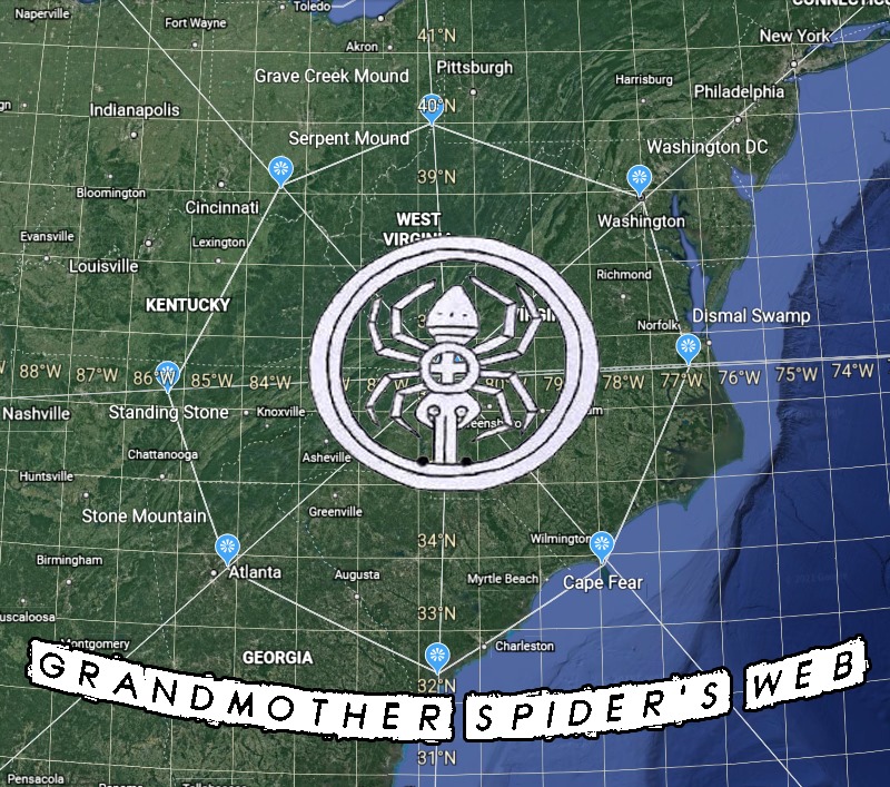 If one looks at the area within you have Hellier and Somerset Kentucky, both explored within the show, Hellier. Point Pleasant and the Mothman sightings, energy vortices like Red River Gorge in Kentucky, even the stories of the first people who hunted in what is now Scott County Tennessee. Reliefs and artifacts have been found within a multitude of native cultures and legends about Grandmother Spider. The Cherokee speak of the time that the old Spider brought them light made from pottery she had formed. (Indeed many tribes say that she made them from the same clay as her sculptures). She appears all the way to the mound builders that formed many of the earthworks we now consider sacred. If we look at the octagon earth works in Heath Ohio, it is specifically attuned to lunar alignments, another nod to the lunar qualities of Grandmother.