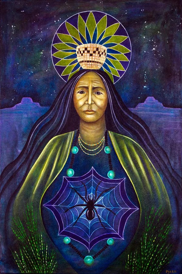 In other Native American myths, Spider Woman is the Creator of all things and also known as Thought Woman. She is the stillness, the creative energy before it takes shapes or form. She is all-powerful, possessing a power that is beyond all imagination. She is the sharpest, most focused thought, the clearest vision, the one with power unimaginable.