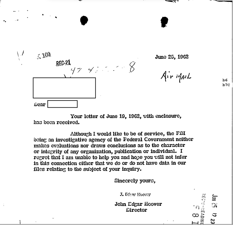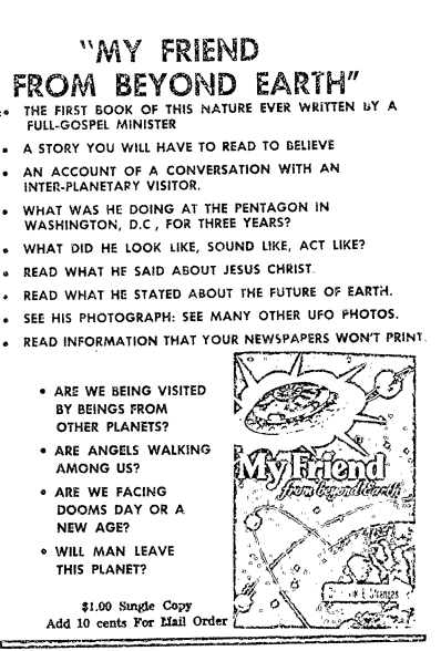 I would be remiss if I didn’t talk a little about “My Friend from Beyond Earth” which was published in 1960 and could often be found at Frank’s lectures (and is mentioned frequently in the FBI FOIA).
