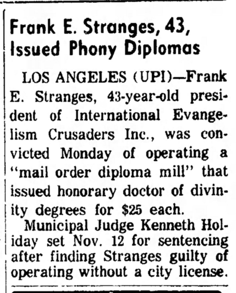 Some of my earliest info on Dr. Stranges would actually come from a story from The Minneapolis Star from January 8th, 1952, when Frank was abducted at gunpoint and forced to drive 75 miles. Nothing was stolen, as reportedly the gunman took his wallet and saw he was a minister and only had $2 on his person. Stranges was pastor at the Spring Lake Assemblies of God church (which was currently under construction).