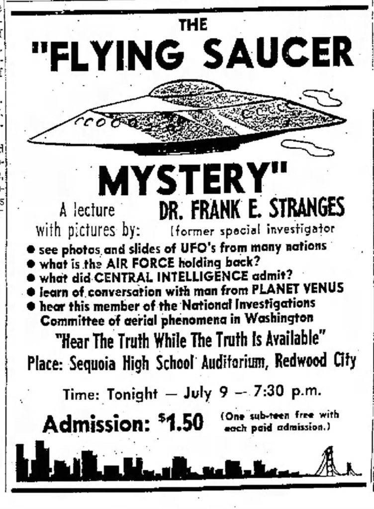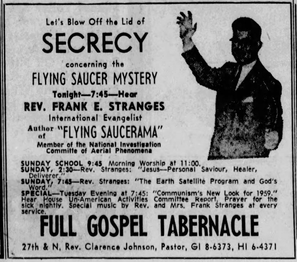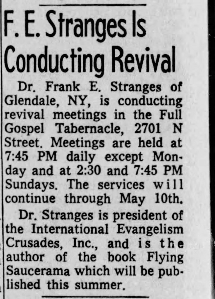 It is interesting to note that he was a member of the NICAP, not to be confused with the organization that he would later be the founder of the National Investigations Committee on Unidentified Flying Objects (NICUFO). By the time of this advertisement, he had also published his first book “Flying Saucerama” that same year by International Evangelism Crusades as mentioned in an article from that same paper. This would factor into what would follow Frank for most of his life as it brings into question his credibility: