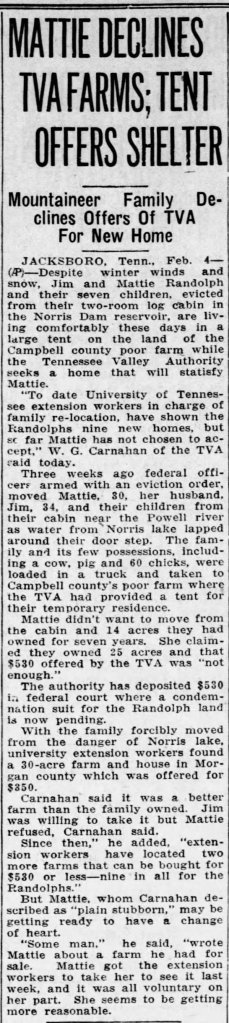 Some families refused to be moved. After all, they had farmed the land, bled for it, and lived with it, for generations. Mattie Randolph, whose story was partially used in the 1960s movie “Wild River”. The Slate has an excellent write-up about “The Family that wouldn’t leave” that I highly recommend. As you can read in the newspaper article enclosed though, it shows a good snapshot of the times and the grit of the people.