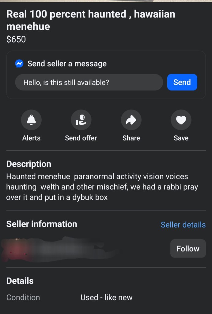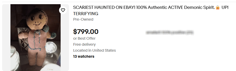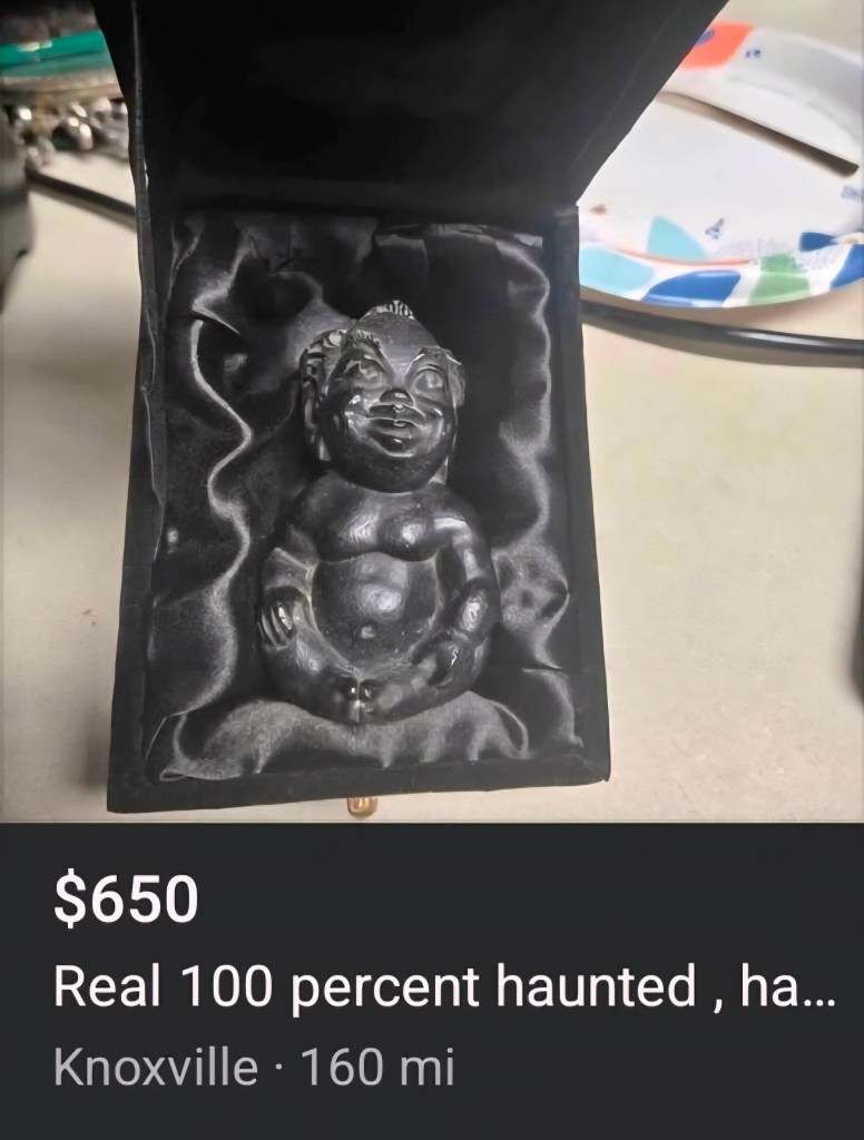 He seems like a jovial fellow from the pictures in the listing. I wonder why anyone would think it’s haunted, let alone have a “rabbi pray over it and put it in a dybuk box”. If you have read the blog before, you’ll know we talked all about the Dybuk box and it’s problematic history in the Paranormal community. I’m not sure what documented history this item has in it’s “vision voices haunting welth and other mischief” but it certainly sounds like a character that anyone would need to charge a very high price just to consider letting it leave their stewardship. I mean the wise Mr. Wing said in 1984’s “Gremlins“: “With Mogwai, comes much responsibility. I cannot sell him at any price.”